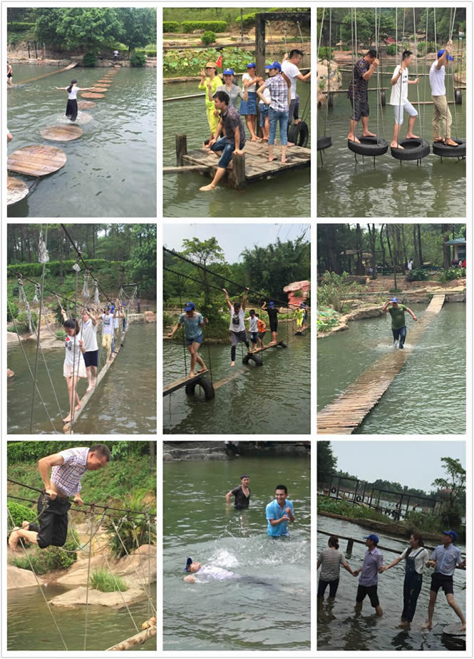 水上項(xiàng)目眾多,不來(lái)些水上運(yùn)動(dòng)真是辜負(fù)這清涼世界了。于是,歡樂(lè)的水上團(tuán)隊(duì)運(yùn)動(dòng)競(jìng)賽在鄧總的組織下拉開(kāi)了序幕。我們被分成了6個(gè)隊(duì),由各自隊(duì)長(zhǎng)帶領(lǐng)依序完成所有水上項(xiàng)目,耗時(shí)最少者獲勝。考驗(yàn)團(tuán)隊(duì)協(xié)作能力的時(shí)候到了,每隊(duì)作戰(zhàn)方式也不同。有的隊(duì)長(zhǎng)選擇帶頭走在最前面,鼓舞幫助后面的伙伴;有的隊(duì)互相牽著,攜手共進(jìn):有的隊(duì)長(zhǎng)讓膽大的男生走在前頭,自己在后面照顧婦女,膽小者。當(dāng)然,趣事多多,有50多歲的倉(cāng)庫(kù)員大叔水上連翻跟斗,老當(dāng)益壯;有小伙伴過(guò)深不可見(jiàn)的水上圓木時(shí),全身浸了個(gè)清涼,我也在此關(guān)連連被喝了幾口水;水珠飛濺,心心相連,歡聲笑語(yǔ)回蕩在山中。水中清爽之旅在我們的水中大合照中快樂(lè)結(jié)束。